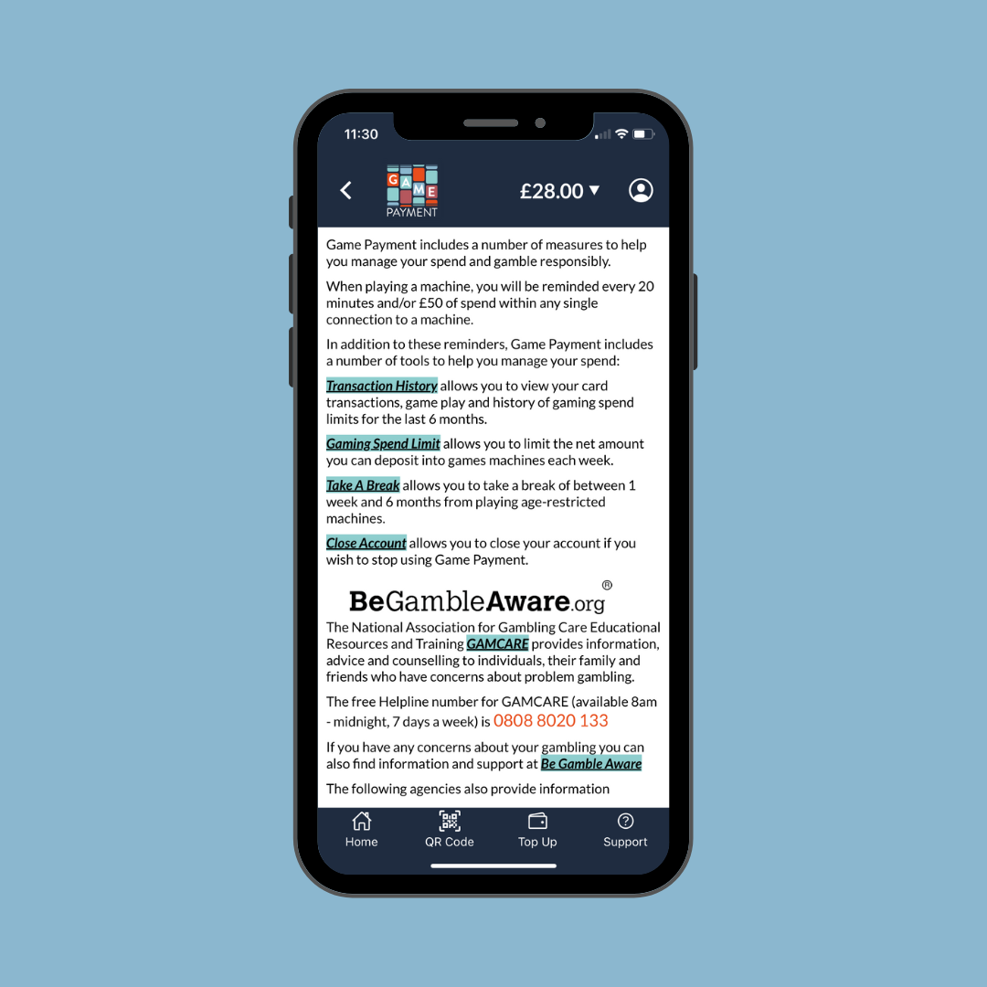 Game Payment includes a number of measures to help you manage your spending and to gamble responsibly. For more information, press the Safer Gambling button on the app's Home page. You will also find a Safer Gambling section in the main menu.